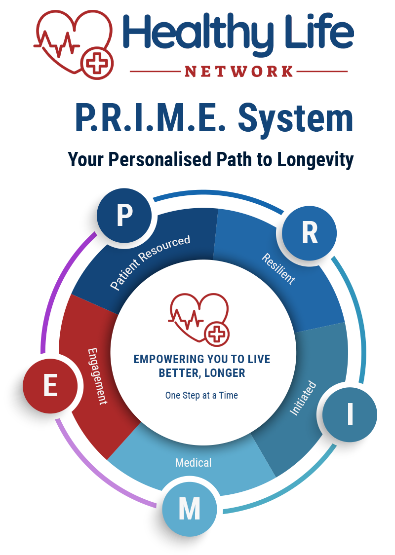 The Healthy Life Network PRIME Blueprint comprises five frameworks, a patient-empowered, data-driven longevity system designed to transform how individuals engage with their health. PRIME helps members manage their health through regular checkups, personalised plans, and ongoing support. This allows them to live longer, healthier lives.